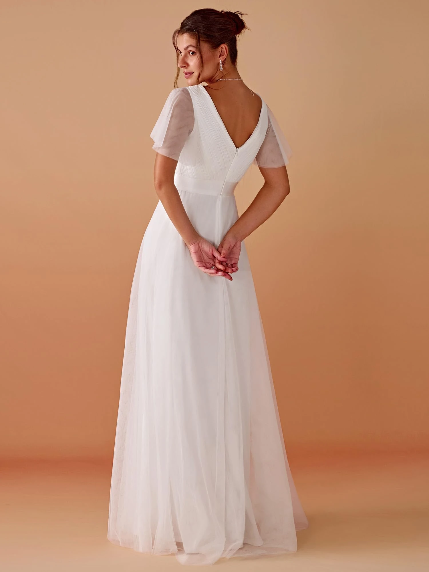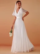 MisShow Elegant Wedding Dress Ivory White Sexy V-Neck Backless Sheer Short Sleeve